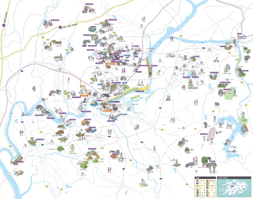 나주 관광안내지도 페이지 정보 작성자 관리자 댓글 0건 조회 10회 작성일 25-11-14 17:07 목록 본문 나주는 영산강을 따라 펼쳐지는 8경 명소를 통해 생태와 역사가 조화된 경관을 보여줍니다. 특히 느러지곡강, 풍영정, 석관정 같은 장소는 강변 자전거길과 고요한 전망 포인트로 매력적입니다. 금성관은 조선 시대의 행정 중심지였던 역사적인 건축물로, 고풍스러운 분위기를 느끼기에 좋습니다. 산림자원연구소와 나주호 둘레길은 숲과 호수가 어우러진 힐링 공간으로, 자연 산책이나 사진 촬영에 탁월한 장소예요. 관련링크 https://www.naju.go.kr/tour 7회 연결 이전글전라남도 산림자원연구소 25.11.14 다음글대동여지도 나주지역 25.11.14 댓글 0 댓글목록 등록된 댓글이 없습니다.