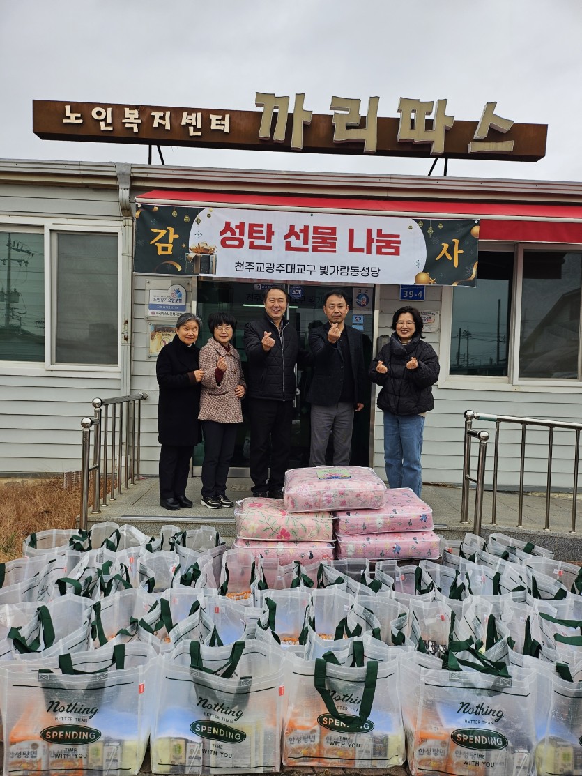 빛가람동 성당 성탄맞이 선물 전달 페이지 정보 작성자 관리자 댓글 0건 조회 111회 작성일 25-12-24 12:25 목록 본문 성탄절을 맞아 천주교광주대교구 빛가람동성당(주임신부 김연준프란치스코)은 본 센터를 찾아 예수님탄생을 지역어르신들과 함께 축하하고자 손수 마련한 선물꾸러미(40세트)와 이불(10개)을 전달 해주셨습니다. 선물을 보내주신 빛가람동성당 모든 분들에게 감사의 말씀을 전합니다 이전글나주보우회 사랑의 쌀 기증 25.12.30 다음글성탄 맞이 기부금 전달식 25.12.20 댓글 0 댓글목록 등록된 댓글이 없습니다.