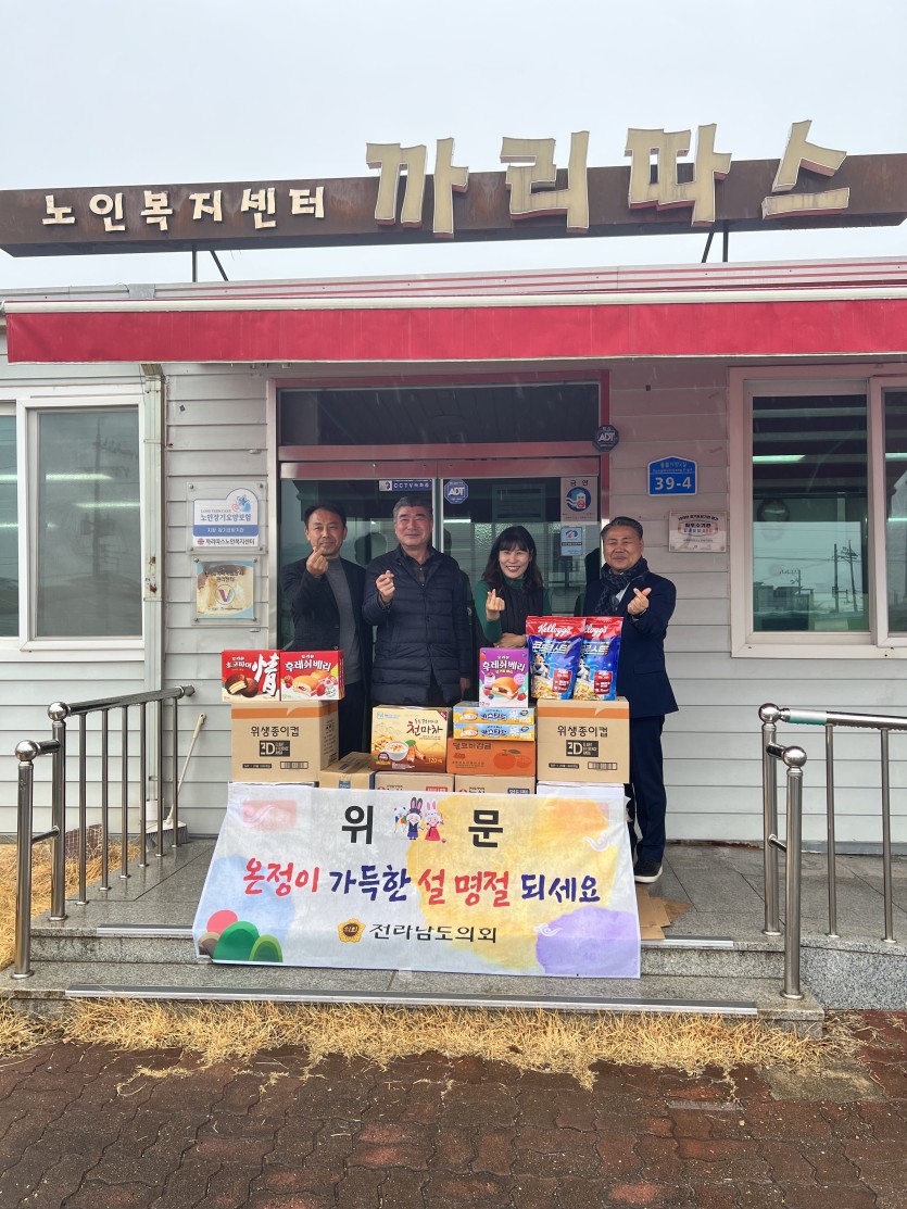 최명수 전남도의원님 위문품 전달 페이지 정보 작성자 관리자 댓글 0건 조회 61회 작성일 26-02-10 15:54 목록 본문 설 명절을 맞아 바쁘신 중에도 정성 가득한 선물을 준비해서 찾아주신 최명수 도의원님과 도의회 사무국 직원분들에게 감사의 말씀을 전합니다. 정성 가득한 선물은 어르신들을 위해 사용 하겠습니다. 이전글2025년 결산서 26.02.23 다음글2026년 예산서 26.01.07 댓글 0 댓글목록 등록된 댓글이 없습니다.